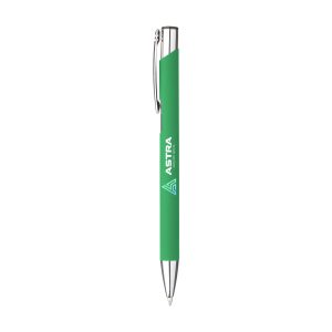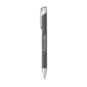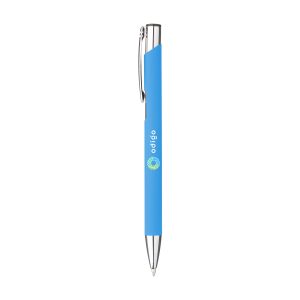 Kúlupenni úr áli með málmklemmu og bláu bleki. Yfirborð pennans er með gúmmíhúð sem gerir það að verkum að hann er stöðugur í hendi.